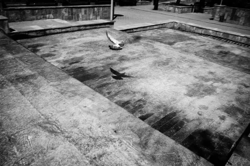 Fight or flight, you can't beat your own shadow! A pigeon in flight over a waterfall in Curtea de Arges, Arges County, Romania