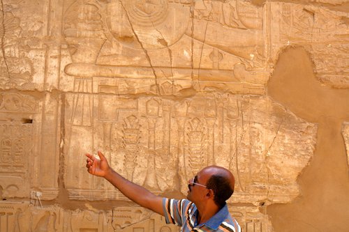 An Egyptian guide showing carved hieroglyphs at the Mortuary Temple of Hatshepsut, or Djeser-Djeseru, beneath the Deir el-Bahari cliffs, near the Valley of the Kings