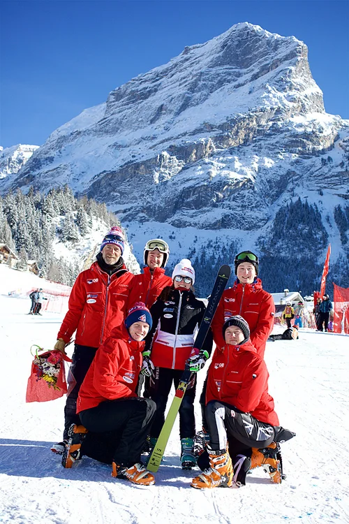 GB Telemark Team members James French, Fred Thomas & Jasmin Taylor in Murren, Switzerland at the British Telemark Championships.