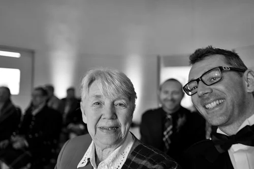 Wedding ceremony selfie 2, with Mum & Gordon Mann in the background.