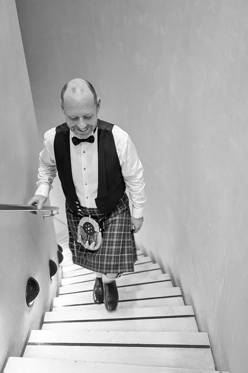 The wedding photographer photographs Myke & Stuart on the stairs 2.